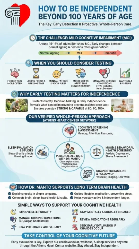At the Athens Heart Center network, neurocognitive testing helps people understand how their brain is working today and what they can do to protect it for the future. Dr. Manto focuses on early detection, simple explanations, and practical steps so patients can stay independent for as long as possible.