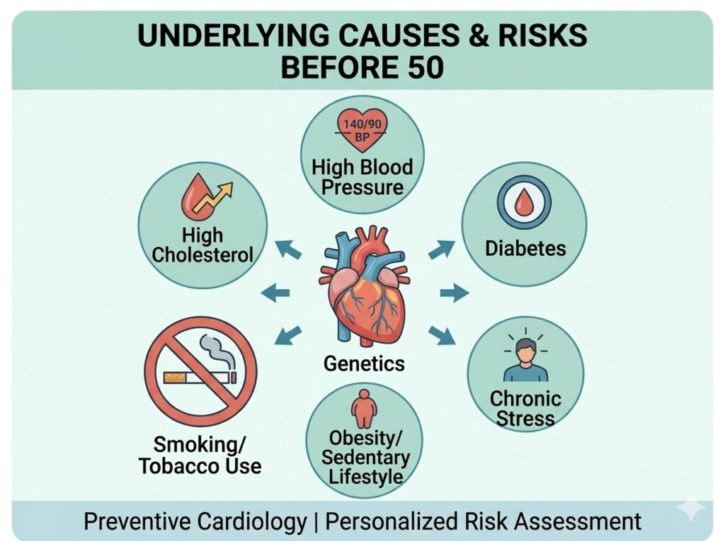 Medical science now shows that heart attacks under age 50 are rising due to modern lifestyle patterns and delayed detection. While an event may feel sudden, the underlying plaque buildup (atherosclerosis) often takes years to develop. Research indicates that one in five heart attack patients is now under the age of 50, a trend driven by metabolic syndrome and sedentary lifestyles (Arora et al., 2019).